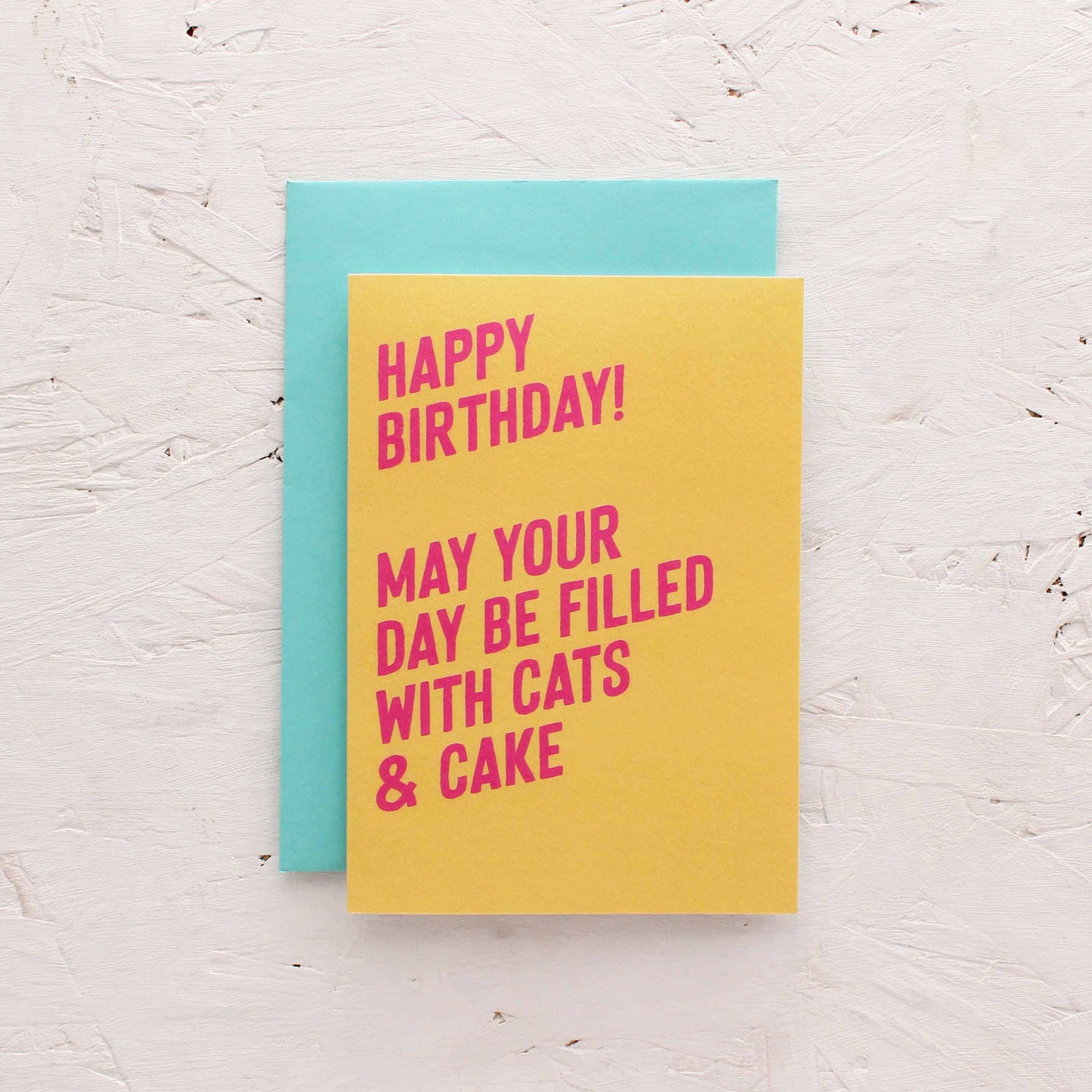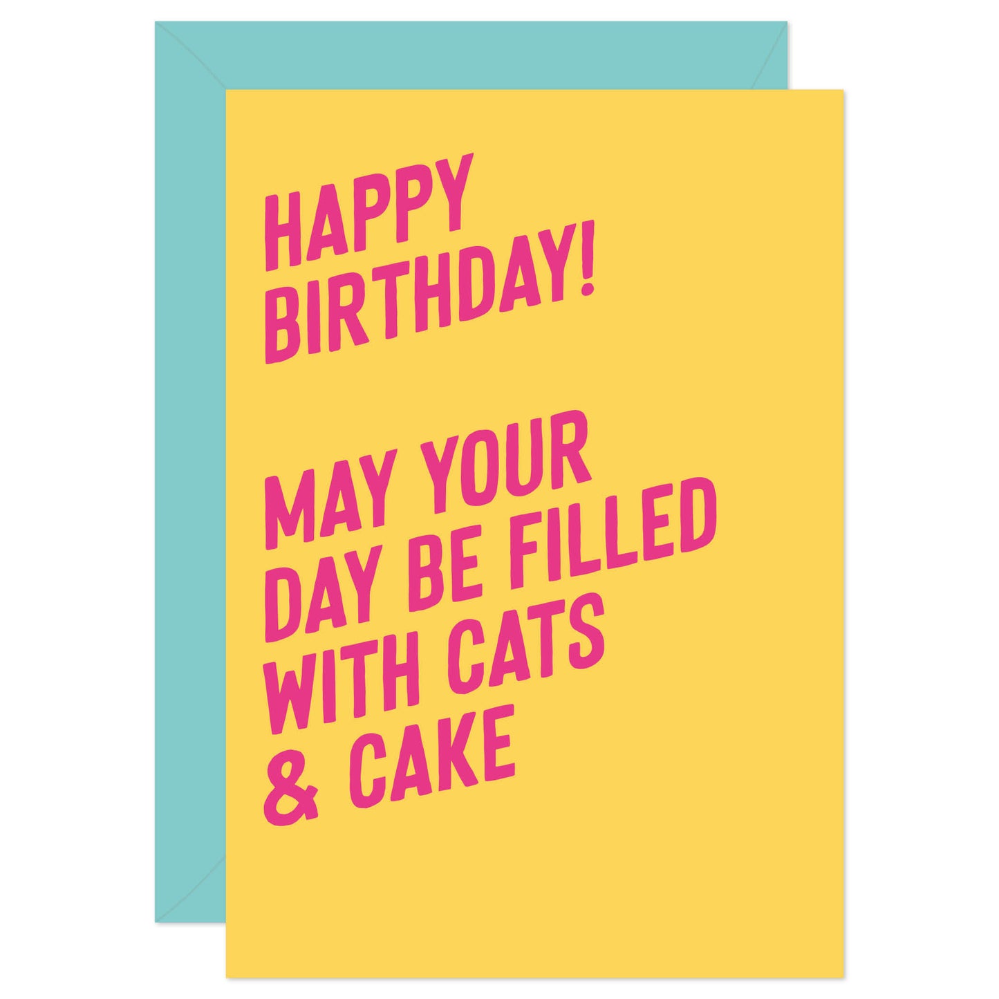 Wish a cat lover a happy birthday and a day filled with cats and cake with this colourful birthday card.