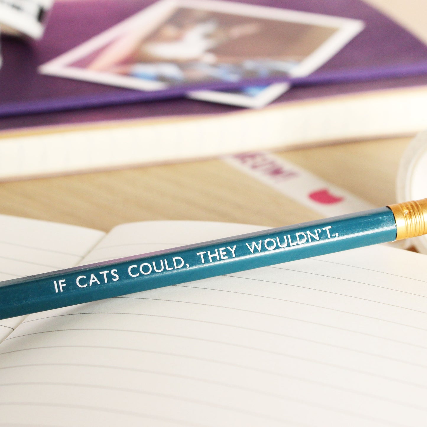 Would cats do stuff, even if they could? I don't think so! Share your love of cats with this teal pencil perfect for any cat lover to use everyday. The cat pencil features white embossed text and a white eraser.